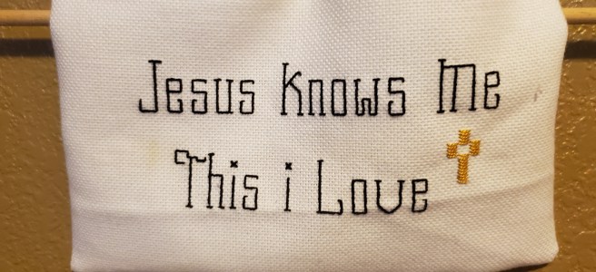 “I am the good shepherd. I know my own and my own know me.”John 10:14 I have this sign hanging in our office at home. My grandma made it for me years ago. I’ve had it for years, but I’ve never really contemplated the magnitude of the truth it conveys through a simple twist of … Continue reading Jesus Knows Me. This I Love.